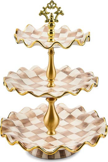 Hand-painted checks and an ornate knob top are anything but basic on this ceramic stand that provides three tiers to display your sweetest treats.