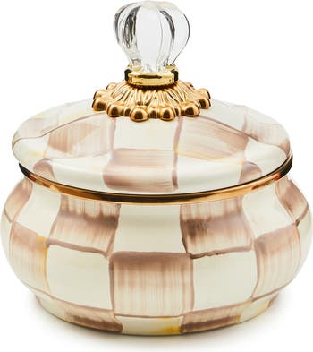 Gilt details highlight the hand-painted color-dragged checks of this adorably chubby lidded pot you can use to charmingly stash treasures in any room in your home.