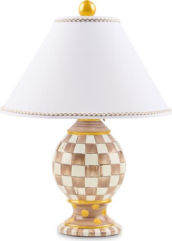 This handmade table lamp makes a charming addition to any room with its hand-glazed, hand-painted checks and fabric-covered shade accented with braided trim.