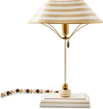 Espresso-inspired hues add to the autumnal appeal of this striped-lampshade table lamp detailed with a beaded lamp cord.