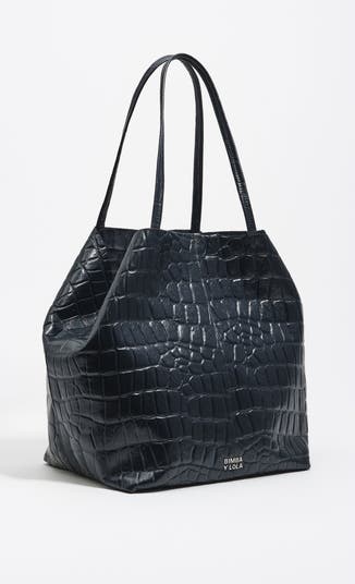 Large leather shopper bag with double shoulder straps, silver metallic BIMBA Y LOLA logo, interior pocket, and lobster clasp closure.