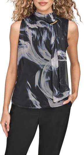 A marbled print swirls across this chiffon top with a gathered neckline punctuated by gleaming hardware.