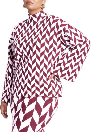 When you feel like dialing up the drama build your look with the bold diamond-herringbone pattern of this sweater framed with wide, flared sleeves that punctuate every gesture you make.