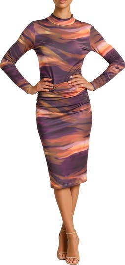 Effortlessly refined, the Area Stars mock neck midi dress features a bold print on a timeless, classic silhouette. Crafted from soft stretch fabric, it offers a fitted bodice, long sleeves, and a flowing midi skirt for a flattering, versatile look. Perfect for day-to-night styling, it brings modern elegance to any wardrobe.