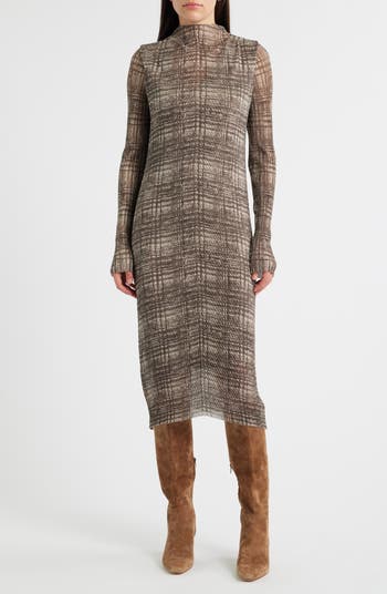 An allover pattern brings warmth and polish to this figure-skimming maxi made with a sophisticated mock neck.