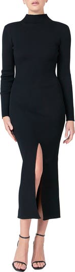 Sleek and sophisticated, this mock-neck midi features allover ribbing for a close fit and an airy front slit for easy movement.