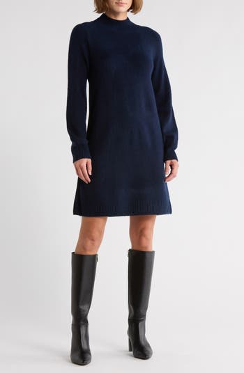 A leg-baring length adds to the fun of this long-sleeve knit dress that will have you strutting—not stepping into sweater season.