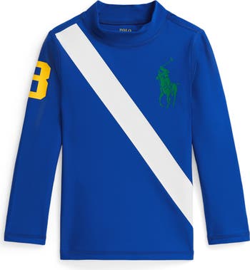 A mock neck and sporty graphics add to the fun, beach-ready vibe of a long-sleeve rashguard cut from a durable, moisture-wicking UPF 50+ stretch-nylon blend.