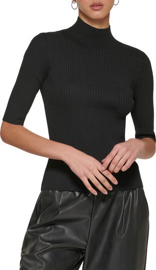 This sophisticated mock-neck sweater is knit with elbow-length sleeves and allover ribbing.
