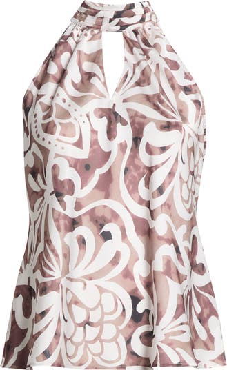 A layered pattern dapples the silky fabric of this sleeveless top with a pleated mock neck that adds a note of crispness to the soft style.