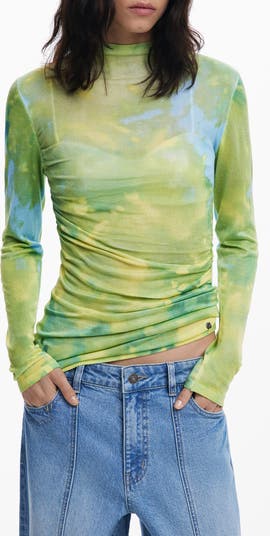 Ultralightweight yarn furthers the retro vibes of this airy mock-neck sweater featuring a bold watercolor pattern.