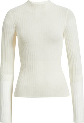 Subtle contrast ribbing lends eye-catching dimension to a mock-neck pullover sweater made from a cozy virgin wool blend and cut for a snug, figure-sculpting fit.