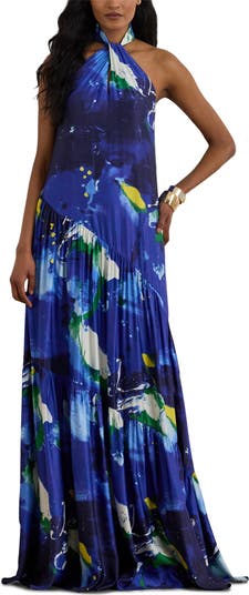 This linen-enhanced gown makes a head-turning statement as you enter any event with its twisted high neckline and floor-sweeping skirt.
