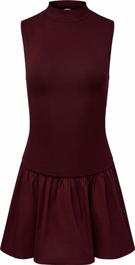- This sleeveless mock-neck dress has a smooth jersey bodice, featuring a U-shaped drop waist, that’s joined by a crisp poplin miniskirt. Mock neck U-shaped waist Sleeveless Mini length balloon skirt Snug fit 94% Cotton 6% Spandex Dry clean only.