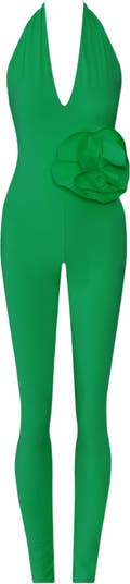Jumpsuit with a halter neckline and an oversized 3D floral embellishment. Wide open leg silhouette along a high-waisted underwear for a stylized effect.