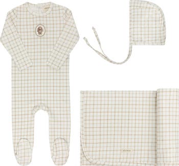 The Modal French Terry Plaid Sheep Collection - Take Me Home Set includes a cozy footie, blanket and a matching bonnet, making it the perfect gift for welcoming a new baby. Crafted from soft, breathable modal fabric with a charming plaid sheep design, this set offers both warmth and comfort. Gift a bundle of softness and style that’s sure to be cherished from day one.