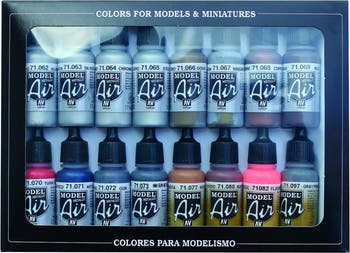 VALLEJO: MODEL AIR PAINT - METALLIC EFFECTS - Unlock the brilliance of metallic finishes with the Vallejo Model Color Metallic Effects Colors Set. This premium set includes 16 expertly formulated metallic acrylic paints, each in an 18 ml (0.60 fl.oz.) bottle, perfect for adding stunning shine and depth to your modeling projects. Whether you’re painting sci-fi miniatures, military models, or fantasy figures, these metallic paints offer smooth, high-opacity coverage and can be easily applied to create dazzling effects, from polished metals to weathered, aged surfaces. Designed for both beginners and advanced painters, the Vallejo Model Color Metallic Effects Set provides a versatile range of metallic tones to suit any project, allowing for easy blending and layering to achieve the perfect look. Elevate your model painting with the rich, radiant finishes this set has to offer and create striking, realistic metallic surfaces with ease. INCLUDES: 16 Bottles - 18ml (0.60 fl oz) each. COLORS INCLUDE: 71.062 Aluminum (Metallic), 71.063 Silver RLM01 (Metallic), 71.064 Chrome (Metallic), 71.065 Steel (Metallic), 71.066 Gold (Metallic), 71.067 Bright Brass (Metallic), 71.068 Copper (Metallic), 71.069 Rust (Metallic), 71.070 Signal Red (Metallic), 71.071 Artic Blue (Metallic), 71.072 Gun Metal (Metallic), 71.073 Black (Metallic), 71.077 Wood, 71.080 Rust, 71.082 Fluorescent Red, and 71.097 Medium Gunship Gra.