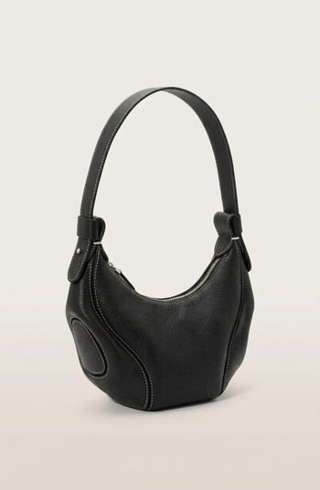 This shoulder bag features a sculpted, curved silhouette that creates a modern, architectural look with subtle dimension. Crafted from textured leather, it offers a structured yet soft feel that holds its shape beautifully. The top zip closure keeps essentials secure, while the adjustable shoulder strap allows for a customized, comfortable fit. Finished with contrast stitching and contour paneling, it brings a refined, directional edge to everyday styling.