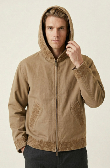 This hooded jacket features intricate embroidered detailing along the trim and pockets, adding subtle texture and elevated character. Designed with a full zip front and relaxed structure, it offers a clean yet distinctive silhouette. The soft finish and tailored shape create a refined balance between comfort and statement design. Pair it with tailored trousers or casual pieces for a versatile outer layer that stands out with understated detail.