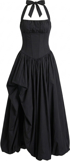 This halter neck maxi dress features a structured corset-style bodice with soft gathering at the bust, creating a sculpted yet feminine silhouette. The open back is finished with adjustable lace-up detailing, while the halter tie adds a delicate, elevated touch. A voluminous full-length skirt brings fluid movement and drama, balanced by the clean, tailored lines of the waist. Designed with a refined, modern sensibility, this piece offers a striking silhouette suited for both daytime events and evening occasions.
