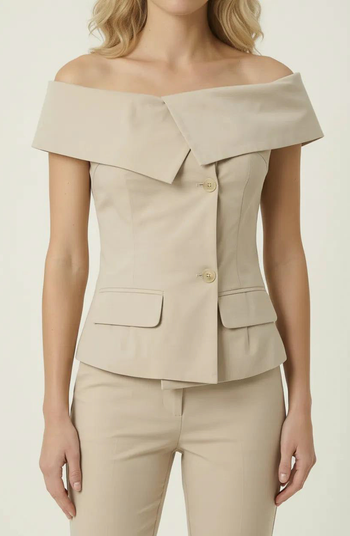 This off-shoulder tailored top features a structured silhouette with a striking foldover collar that frames the neckline beautifully. Designed with a clean button-front closure and subtle shaping seams, it creates a flattering, contoured fit. The tailored finish gives it a polished, elevated feel while maintaining a modern edge. Style it with matching trousers or denim for a refined look that transitions seamlessly from day to evening.