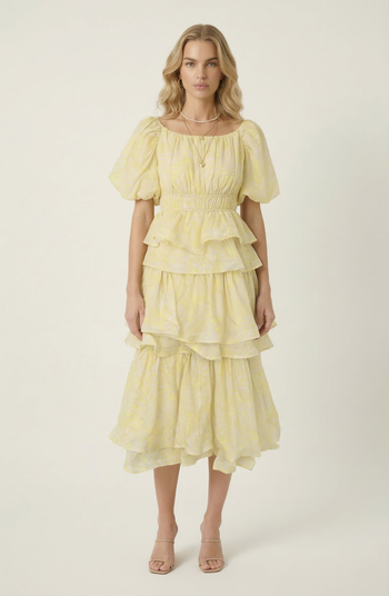 This feminine midi dress features soft puff sleeves and a gently gathered neckline that creates a romantic, airy silhouette. The elasticized waist enhances the shape while layered ruffle tiers add movement and soft volume throughout the skirt. Subtle textured fabric brings dimension and visual interest to the design. Finished with a flowing midi length, it offers an elegant look that feels both light and refined.