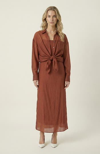 - Two-piece midi dress set with a sleek slip-style dress paired with a lightweight sheer button-down shirt