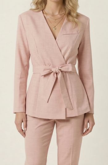 This wrap-style blazer features a clean, tailored silhouette with a softly structured finish for a refined, modern look. Designed with a deep V neckline and subtle double-button detailing, it creates a flattering, contoured shape through the bodice. The adjustable waist tie belt enhances definition while adding a soft, feminine touch. Style it with matching trousers or denim for a polished outfit that transitions seamlessly from day to night.