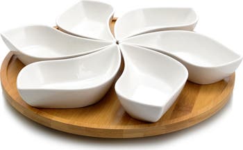 Modern 13.5 Inch 7pc Lazy Susan Appetizer and Condiment Server Set with 6 Unique Design Serving Dishes and a Wood Lazy Suzan Serving Tray