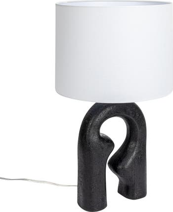 - This strikingly contemporary table lamp features an abstract sculptural resin base topped with a white drum shade