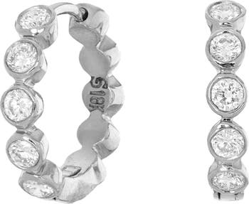 A modern bezel silhouette brings five diamonds to each of these shapely hoop earrings.
