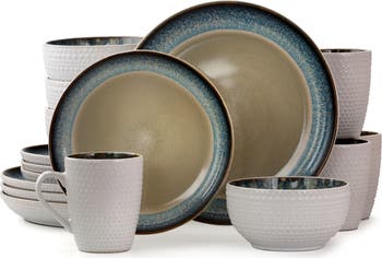 Add a beautiful accent to your dining table with the Elama Modern Dot 16 Piece Round Stoneware Dinnerware Set in hues of Taupe, Blue and Brown. Each stoneware dish is creatively crafted into unique and contemporary shapes, making your plates the talk of the evening. Each piece is microwave safe for quick reheating and dishwasher safe for easy cleaning.