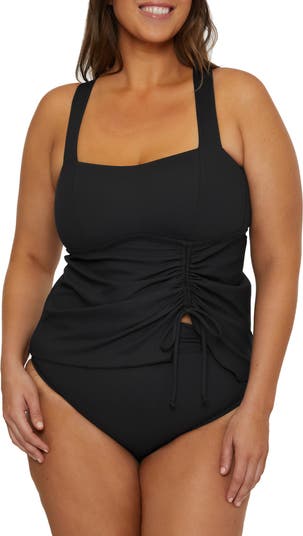 An effortless drape defines the bodice of this ribbed tankini with adjustable tie straps at the back for the perfect fit every time.