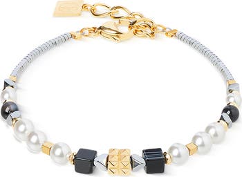 The Modern Elegance Spikes gold bracelet exudes modern sophistication with its combination of gold-plated spikes cube, elegant striped onyx, Swarovski Crystal Pearls and haematite with titanium oxide refinement. Each piece is unique, as the grain of the onyx varies naturally, creating special individual nuances. The balanced design lends the bracelet an elegant clarity, while the high-quality materials ensure long-lasting quality. Perfectly complemented by hoop earrings, bangles and rings from the Spikes series, the result is a harmonious look with a personal touch.