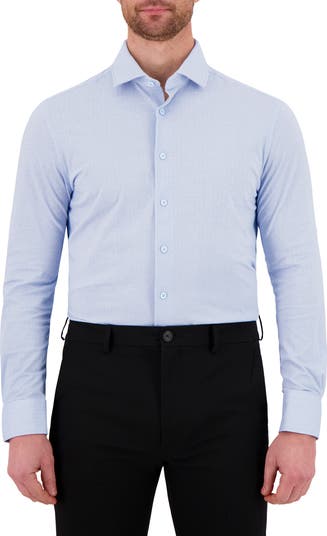 A soft, stretchy cotton knit with a subtle herringbone print brings smart comfort to a dress shirt that breathes easy in the heat and makes a handsome foundation for any semiformal look.
