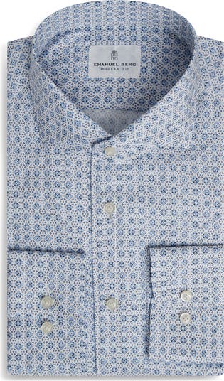 A captivating pattern distinguishes an easy-care dress shirt shaped from pure cotton and fitted with a cutaway collar and rounded, adjustable button cuffs for smart appeal.