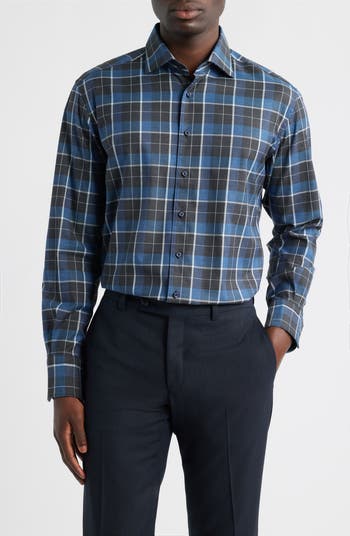 Tailored from crisp cotton twill and patterned in a dark plaid, this wrinkle-resistant dress shirt makes a bold addition to your elevated-casual wardrobe. It pairs well with softer fabrics and solid colors, but there's always room for mixing patterns and textures to define your personal look.