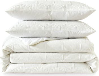 Bring luxurious comfort to your bedroom with a hexagon-textured bedding set featuring a duvet cover and two pillow shams crafted from breathable cotton.