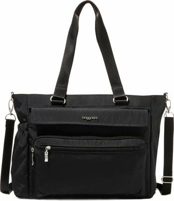 Whether you're using it as a daily laptop tote or a travel laptop tote, this do-it-all bag is sure to rise to the occasion with its padded laptop pocket, convenient luggage sleeve, and a side compartment for your water bottle. An easy-to-adjust crossbody strap adds extra versatility to this laptop travel bag, while the included RFID wristlet offers even more options for staying organized. Exterior dimensions: 18"w x 11.75"h x 6.25"d.