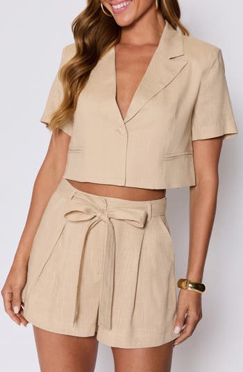 Add a tailored touch to the summery season in a neutral linen-kissed jacket served with short sleeves and cut to a sassy cropped length.