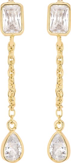 Clean lines meet fluid shine in these duo chain drop earrings. A rectangular cubic zirconia and a teardrop stone are linked by a delicate drape, creating a layered silhouette with soft dimension and graceful movement.