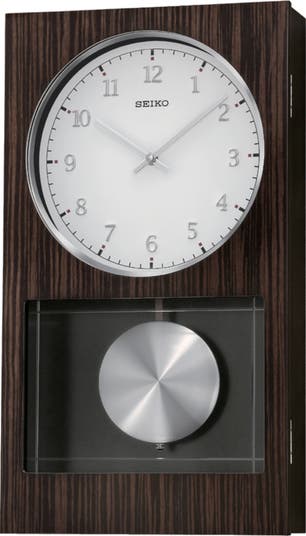 Add a touch of modern elegance to your home or office with this Modern Dark Wooden Wall Clock with Pendulum and Dual Chimes and silver-tone accents from Seiko. It features a Westminster/Whittington chime on the hour and quarter hour with a convenient nighttime chime silence as well as volume control. The 3D numerals make for easy reading on this handsome clock. Powered by 1 C battery (included). Overall dimensions: 18.5 X 10.5 X 3.25 inches. All this with Seiko quartz crystal movement allows for the most accurate time keeping. Perfect for the family room, living room or any space.