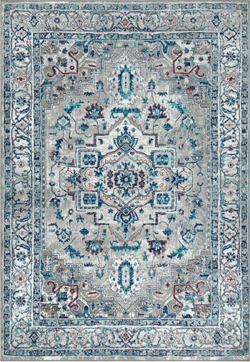 - Neutral gray is enlivened with accents of turquoise and plum in this traditional area rug