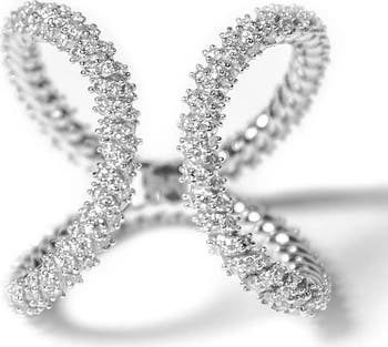A modern wrap ring with sculptural curves and refined brilliance. Pavé-set moissanite stones capture light from every angle, creating the illusion of two bands crossing in effortless harmony. Designed to elevate everyday looks and add polished shine to evening moments. Why We Love It: We love the bold, architectural silhouette paired with luminous moissanite sparkle. The crossover design feels modern and elevated, making it a statement piece that stands beautifully on its own or layers seamlessly with minimal bands. Product Details : • Premium 18k Gold vermeil • Pavé-set moissanite stones • Modern crossover wrap silhouette • Satin finish • Band thickness: 2mm • Height: 20mm • Weight: 5.66 grams • Comfortable for everyday wear