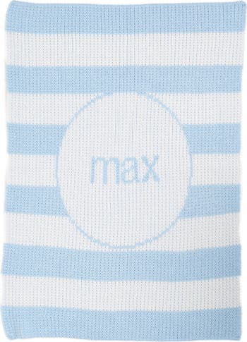 Bring a personalized touch to the nursery with this customizable blanket, knit from a soft yarn and striped in pale baby blue.
