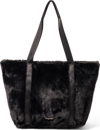 Effortless style. Quiet organization. With its elevated faux fur exterior and thoughtfully designed interior, this tote blends fashion and function in the most refined way. A padded laptop sleeve, discreet interior water bottle pockets, and a smart trolley sleeve offer seamless organization-without sacrificing style. It's the kind of bag that stays calm, collected, and completely capable. Exterior dimensions: 18"w at top x 13"h x 13" w at bottom x 6"d, Weight: 1 lb, 6 oz.