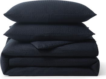 Bring luxurious comfort to your bedroom with a waffle-textured bedding set featuring a duvet cover and two pillow shams crafted from breathable cotton.