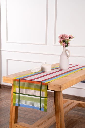 Add a touch of contemporary charm to your dining table with our modernist striped tablerunner. Featuring bold, clean lines, it seamlessly blends style and practicality. Made from durable, easy-to-maintain cotton, it's perfect for everyday meals and special gatherings alike. Expertly block-printed by an eighth generation family of artisans in Jaipur, the artisans are stewards of a craft that has been passed down to them generation after generation. From the master block makers who carve the blocks in a village to the hands that print the cloth, there are many hands that go into making each piece. By selecting this handmade piece, you contribute to reviving craft and supporting artisan communities. Thank you for supporting our artisans. Material: 100% Cotton Dimensions: 90"L x 16"W