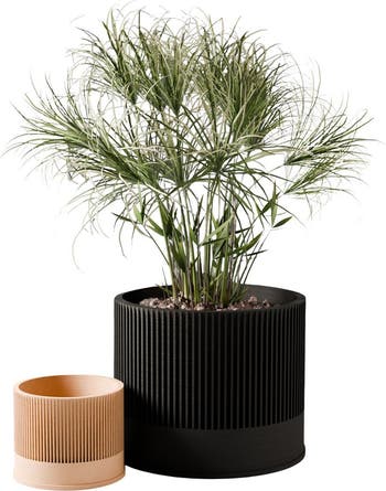 Sizes: Large: Height: 6.5 inches | Width: 7.9 inches | Depth: 7.9 inches Medium: Height: 5 inches | Width: 6.1 inches | Depth: 6.1 inches Small: Height: 3.5 inches | Width: 4.3 inches | Depth: 4.3 inches Looking for something custom? Feel free to reach out for personalized sizes or colors. Modernized design The SAKURA planter was designed with inspiration from the refined simplicity of Japanese aesthetics, merging elegance with practicality. Its sleek ribbed texture and minimalist design offer a timeless, sophisticated look, making it the ideal vessel to beautifully highlight your plants in any setting. The drip tray/saucer is custom-fitted and designed to perfectly complement the planter. Made from 98% Plant-Based Materials | BioPlastic & Wood Fibers