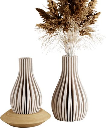 Modernized design The WILLOW Vase was designed to reflect the graceful, flowing movement of nature, inspired by the elegant curves of weeping willow branches. Its slender silhouette and ribbed texture add a refined, organic touch to any space, making it a sophisticated and timeless choice for displaying your floral arrangements. Fully watertight when using the removable waterproof insert. Made from 98% Plant-Based Materials | BioPlastic & Wood Fibers